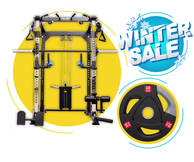 Receive up to 20% off all weights, barbells, benches, and flooring when you purchase a MAXUM fitness Smith Machine.